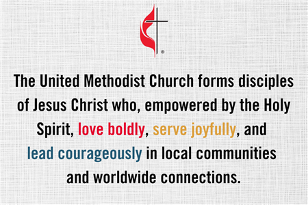 The United Methodist Church forms disciples of Jesus Christ who, empowered by the Holy Spirit, love boldly, serve joyfully, and lead courageously in local communities and worldwide connections.